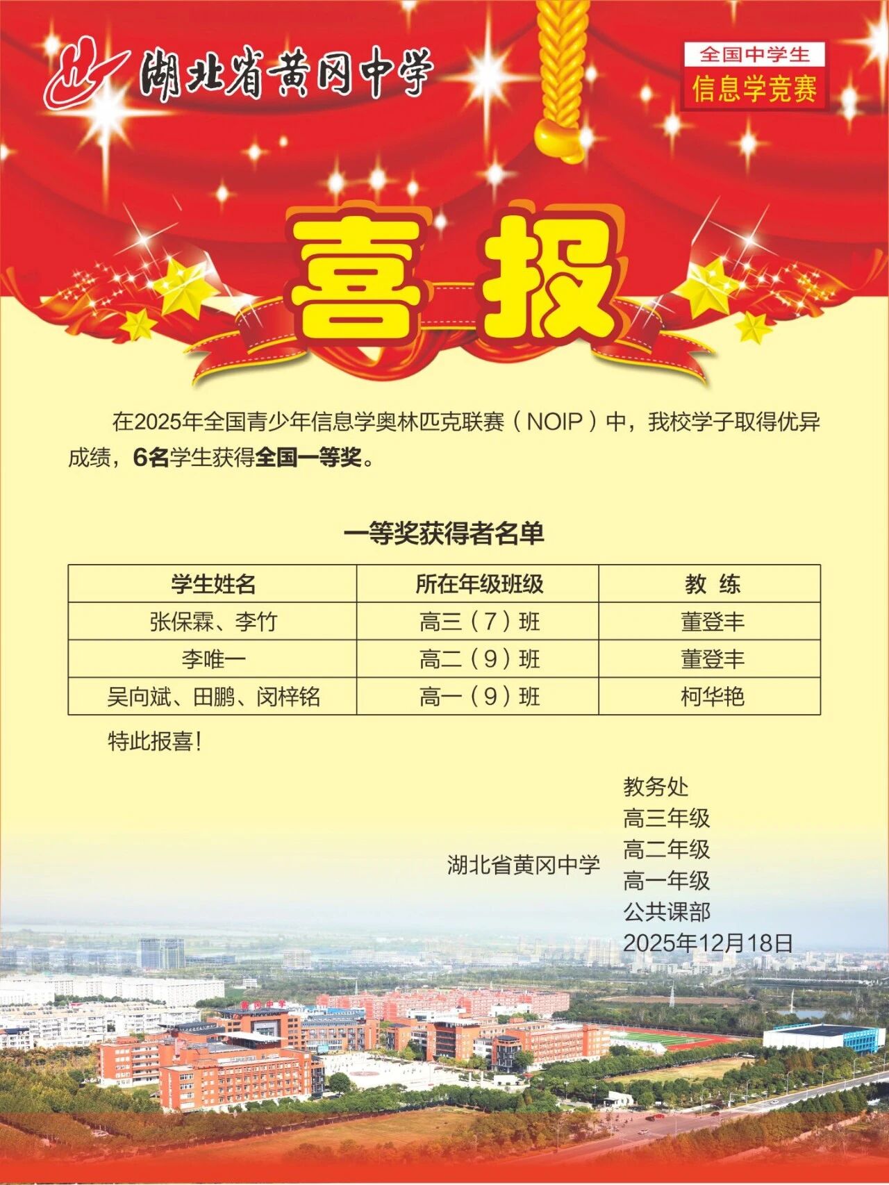 noip獲獎名單NOIP2025獲獎名單黃岡中學(xué)NOIP獲獎喜報(bào)