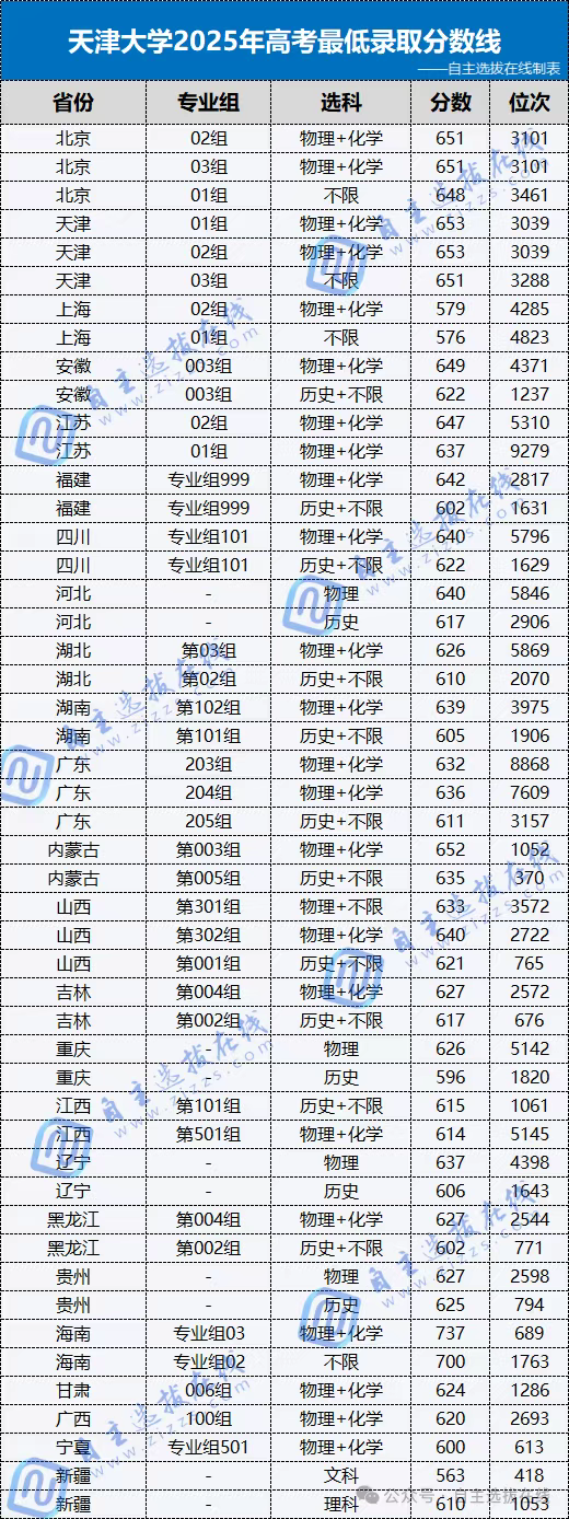 因?yàn)樘旖虼髮W(xué)未公布強(qiáng)基入圍分?jǐn)?shù)線,再加上其入圍分?jǐn)?shù)線是經(jīng)過(guò)加權(quán)計(jì)算或單科“小破格”排名后的數(shù)據(jù),無(wú)法作為高考分?jǐn)?shù)的參考。自主選拔在線團(tuán)隊(duì)根據(jù)各省市教育考試院發(fā)布數(shù)據(jù)收集整理了天津大學(xué)2025年各省市高考最低錄取分?jǐn)?shù)線,供各位考生家長(zhǎng)參考。