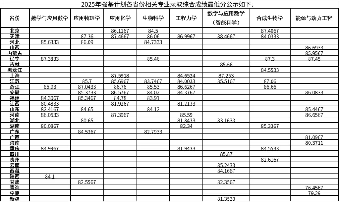 以下是天津大學(xué)2025年強(qiáng)基計(jì)劃各省份相關(guān)專業(yè)錄取綜合成績(jī)最低分公式,因天津大學(xué)錄取分?jǐn)?shù)是由高考成績(jī)與??汲煽?jī)核算后的綜合成績(jī),因此參考意義較小,考生家長(zhǎng)適當(dāng)了解即可。